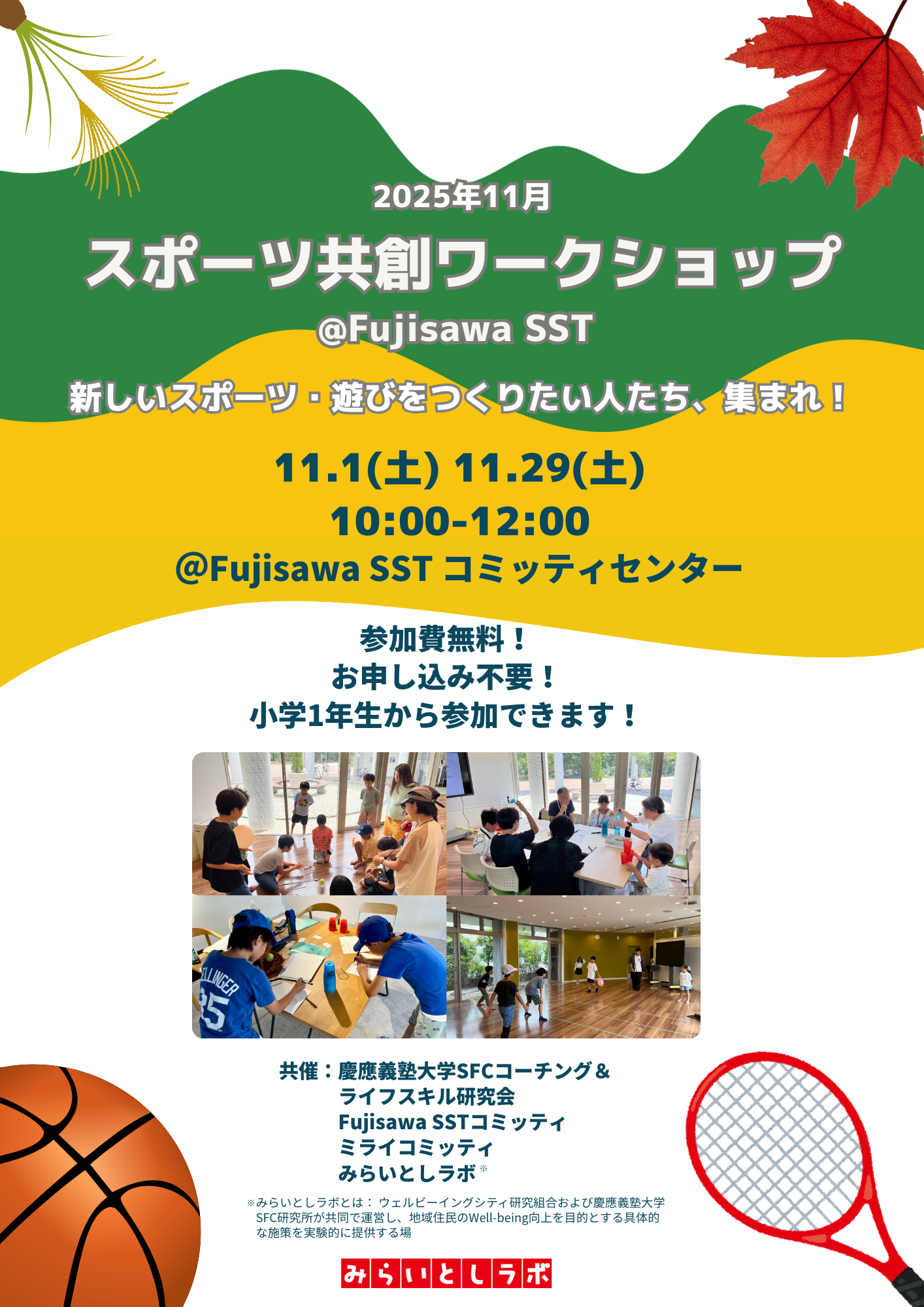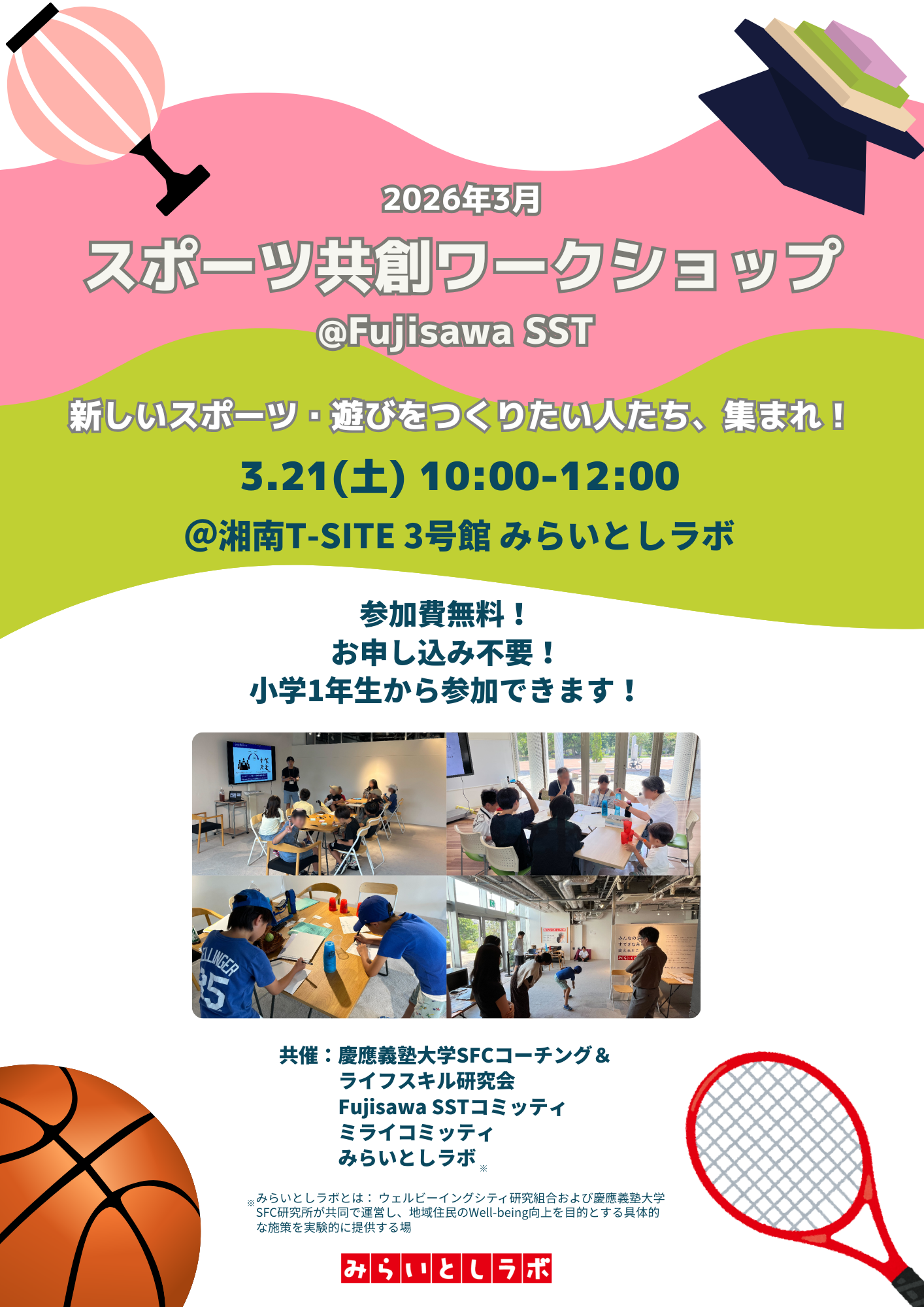 2025年7月より、Fujisawa サスティナブル・スマートタウン(SST)の「みらいとしラボ」にて活動をはじめ、SSTの住民の子どもたちとともに、沢山の遊び・スポーツを制作してきました。今後は、制作した遊び・スポーツを住民の方々に「共有」することに特化したイベントの実施も予定しています。